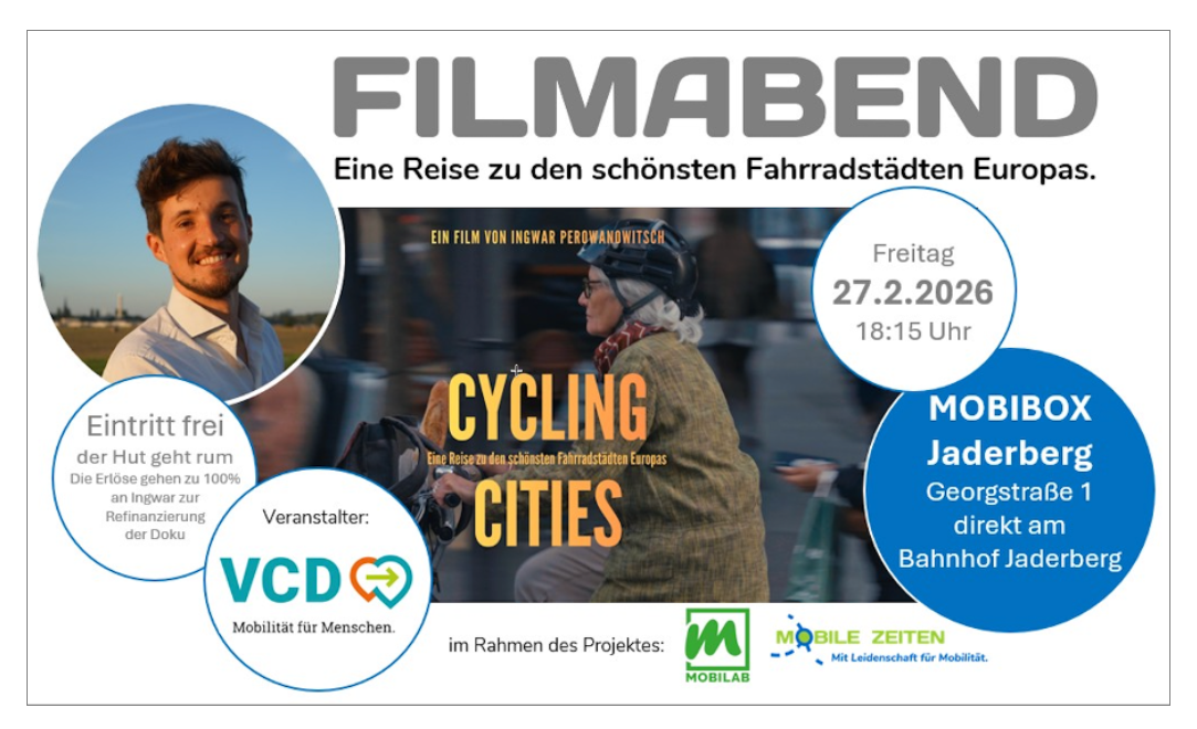 VCD-FILMABEND – „Cycling Cities“ – Jaderberg Der VCD Oldenburg veranstaltet am 27. Februar 2026 einen Filmabend in der MOBIBOX Jaderberg mit dem Dokumentarfilm „Cycling Cities“. Der Film zeigt fahrradfreundliche... Mehr lesen. Klaus Kähler 21.02.2026 0