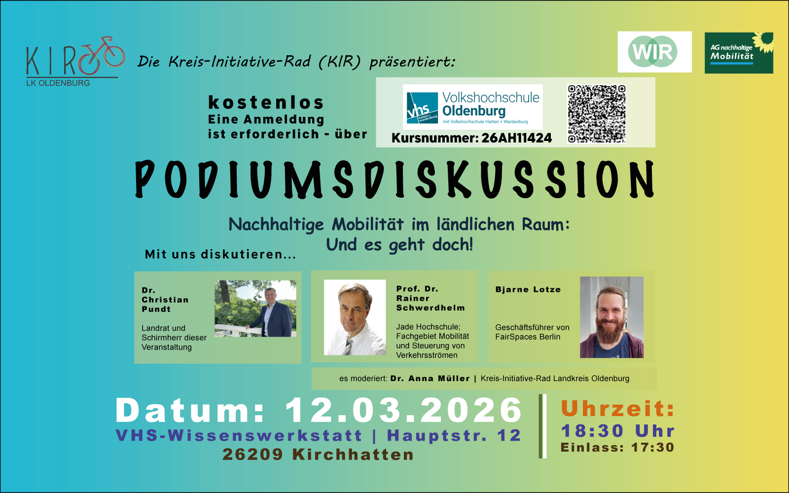 Podiumsdiskussion Der Beitrag kündigt eine Podiumsdiskussion zum Thema nachhaltige Mobilität im ländlichen Raum an, die am 12. März um 18:30 Uhr in der VHS-Wissenswerkstatt Kirchhatten... Mehr lesen. Klaus Kähler 08.01.2026 0
